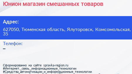 Юнион, магазин смешанных товаров по адресу 627050, Тюменская область, Ялуторовск, Комсомольская, 35 в дальнейшем Организация, размещена в следующих категориях: