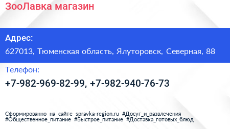 ЗооЛавка, магазин по адресу 627013, Тюменская область, Ялуторовск, Северная, 88 в дальнейшем Организация, размещена в следующих категориях: