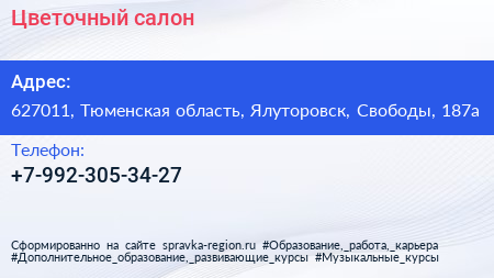 Цветочный салон по адресу 627011, Тюменская область, Ялуторовск, Свободы, 187а в дальнейшем Организация, размещена в следующих категориях: