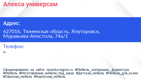 Алекса, универсам по адресу 627016, Тюменская область, Ялуторовск, Муравьева-Апостола, 74а/1 в дальнейшем Организация, размещена в следующих категориях: