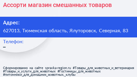 Ассорти, магазин смешанных товаров по адресу 627013, Тюменская область, Ялуторовск, Северная, 83 в дальнейшем Организация, размещена в следующих категориях: