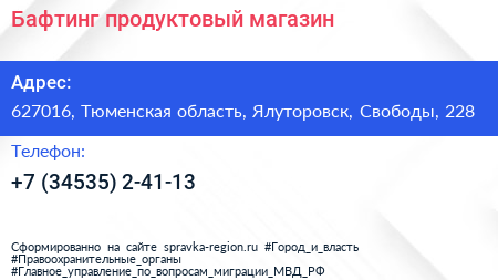 Бафтинг, продуктовый магазин по адресу 627016, Тюменская область, Ялуторовск, Свободы, 228 в дальнейшем Организация, размещена в следующих категориях: