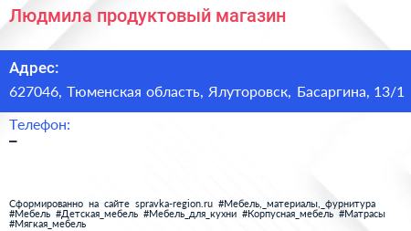 Людмила, продуктовый магазин по адресу 627046, Тюменская область, Ялуторовск, Басаргина, 13/1 в дальнейшем Организация, размещена в следующих категориях: