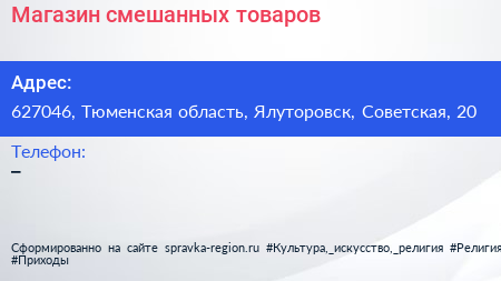 Магазин смешанных товаров по адресу 627046, Тюменская область, Ялуторовск, Советская, 20 в дальнейшем Организация, размещена в следующих категориях: