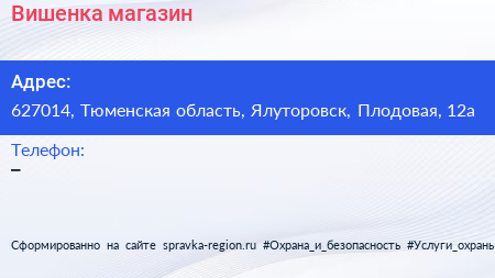 Вишенка, магазин по адресу 627014, Тюменская область, Ялуторовск, Плодовая, 12а в дальнейшем Организация, размещена в следующих категориях: