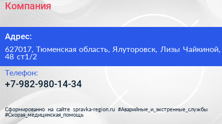 Компания по адресу 627017, Тюменская область, Ялуторовск, Лизы Чайкиной, 48 ст1/2 в дальнейшем Организация, размещена в следующих категориях: