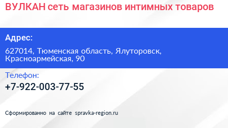 ВУЛКАН, сеть магазинов интимных товаров по адресу 627014, Тюменская область, Ялуторовск, Красноармейская, 90 в дальнейшем Организация, размещена в следующих категориях: