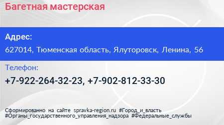 Багетная мастерская по адресу 627014, Тюменская область, Ялуторовск, Ленина, 56 в дальнейшем Организация, размещена в следующих категориях: