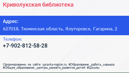 Криволукская библиотека по адресу 627018, Тюменская область, Ялуторовск, Гагарина, 2 в дальнейшем Организация, размещена в следующих категориях: