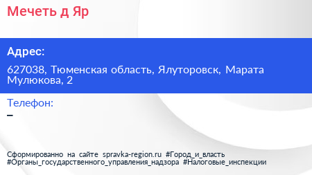 Мечеть, д. Яр по адресу 627038, Тюменская область, Ялуторовск, Марата Мулюкова, 2 в дальнейшем Организация, размещена в следующих категориях: