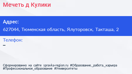 Мечеть, д. Кулики по адресу 627044, Тюменская область, Ялуторовск, Такташа, 2 в дальнейшем Организация, размещена в следующих категориях: