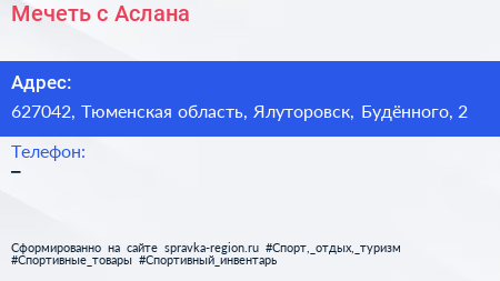 Мечеть, с. Аслана по адресу 627042, Тюменская область, Ялуторовск, Будённого, 2 в дальнейшем Организация, размещена в следующих категориях:
