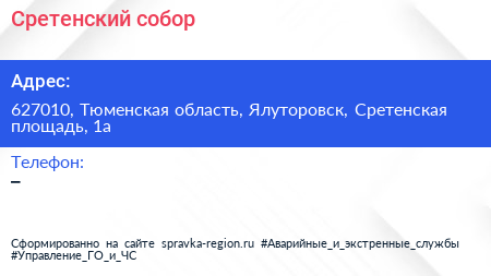 Сретенский собор по адресу 627010, Тюменская область, Ялуторовск, Сретенская площадь, 1а в дальнейшем Организация, размещена в следующих категориях: