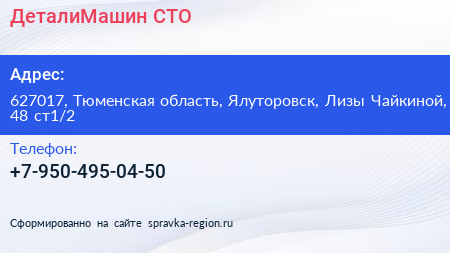 ДеталиМашин, СТО по адресу 627017, Тюменская область, Ялуторовск, Лизы Чайкиной, 48 ст1/2 в дальнейшем Организация, размещена в следующих категориях: