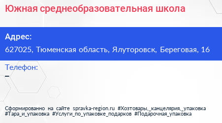 Южная среднеобразовательная школа по адресу 627025, Тюменская область, Ялуторовск, Береговая, 16 в дальнейшем Организация, размещена в следующих категориях: