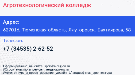 Агротехнологический колледж по адресу 627016, Тюменская область, Ялуторовск, Бахтиярова, 58 в дальнейшем Организация, размещена в следующих категориях: