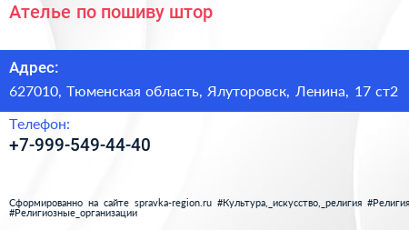 Ателье по пошиву штор по адресу 627010, Тюменская область, Ялуторовск, Ленина, 17 ст2 в дальнейшем Организация, размещена в следующих категориях: