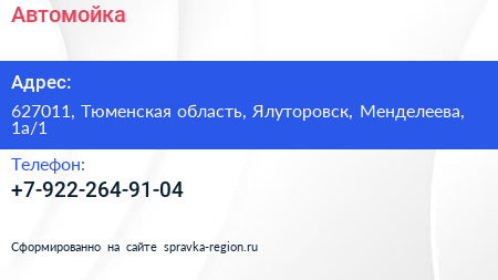 Автомойка по адресу 627011, Тюменская область, Ялуторовск, Менделеева, 1а/1 в дальнейшем Организация, размещена в следующих категориях: