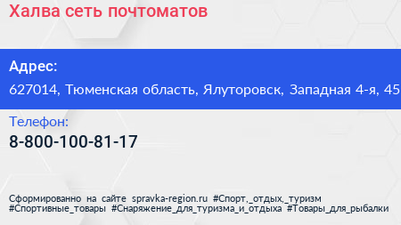 Халва, сеть почтоматов по адресу 627014, Тюменская область, Ялуторовск, Западная 4-я, 45 в дальнейшем Организация, размещена в следующих категориях:
