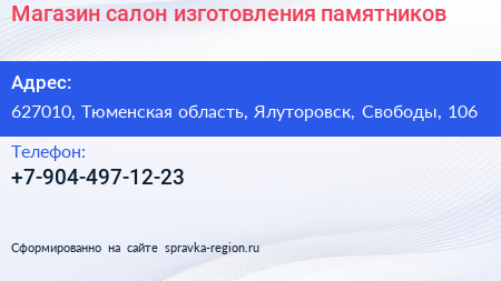 Магазин-салон изготовления памятников по адресу 627010, Тюменская область, Ялуторовск, Свободы, 106 в дальнейшем Организация, размещена в следующих категориях: