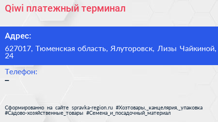 Qiwi, платежный терминал по адресу 627017, Тюменская область, Ялуторовск, Лизы Чайкиной, 24 в дальнейшем Организация, размещена в следующих категориях: