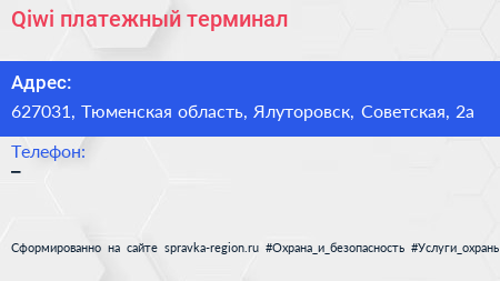 Qiwi, платежный терминал по адресу 627031, Тюменская область, Ялуторовск, Советская, 2а в дальнейшем Организация, размещена в следующих категориях: