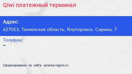 Qiwi, платежный терминал по адресу 627013, Тюменская область, Ялуторовск, Сирина, 7 в дальнейшем Организация, размещена в следующих категориях:
