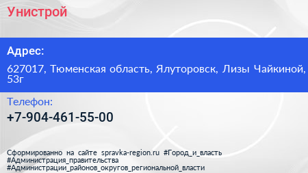 Унистрой по адресу 627017, Тюменская область, Ялуторовск, Лизы Чайкиной, 53г в дальнейшем Организация, размещена в следующих категориях: