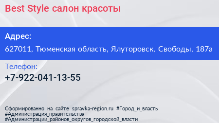 Best Style, салон красоты по адресу 627011, Тюменская область, Ялуторовск, Свободы, 187а в дальнейшем Организация, размещена в следующих категориях: