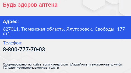 Будь здоров!, аптека по адресу 627011, Тюменская область, Ялуторовск, Свободы, 177 ст1 в дальнейшем Организация, размещена в следующих категориях: