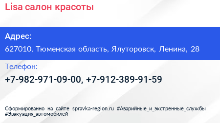 Lisa, салон красоты по адресу 627010, Тюменская область, Ялуторовск, Ленина, 28 в дальнейшем Организация, размещена в следующих категориях:
