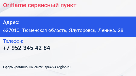 Oriflame, сервисный пункт по адресу 627010, Тюменская область, Ялуторовск, Ленина, 28 в дальнейшем Организация, размещена в следующих категориях: