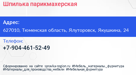 Шпилька, парикмахерская по адресу 627010, Тюменская область, Ялуторовск, Якушкина, 24 в дальнейшем Организация, размещена в следующих категориях: