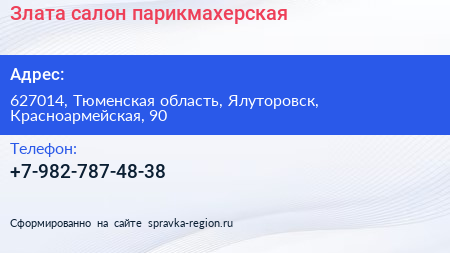 Злата, салон-парикмахерская по адресу 627014, Тюменская область, Ялуторовск, Красноармейская, 90 в дальнейшем Организация, размещена в следующих категориях: