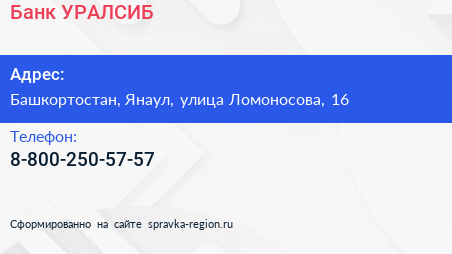 Банк УРАЛСИБ по адресу Башкортостан, Янаул, улица Ломоносова, 16 в дальнейшем Организация, размещена в следующих категориях:
