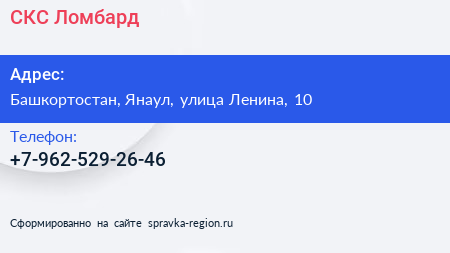 СКС Ломбард по адресу Башкортостан, Янаул, улица Ленина, 10 в дальнейшем Организация, размещена в следующих категориях:
