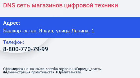 DNS, сеть магазинов цифровой техники по адресу Башкортостан, Янаул, улица Ленина, 1 в дальнейшем Организация, размещена в следующих категориях: