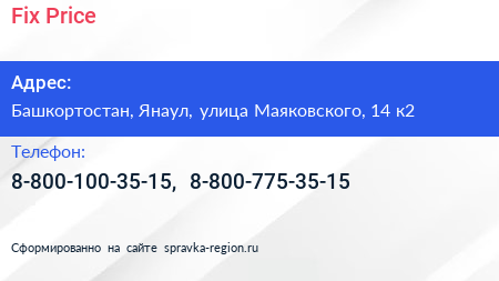 Fix Price по адресу Башкортостан, Янаул, улица Маяковского, 14 к2 в дальнейшем Организация, размещена в следующих категориях: