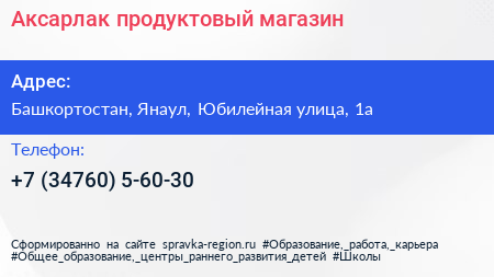 Аксарлак, продуктовый магазин по адресу Башкортостан, Янаул, Юбилейная улица, 1а в дальнейшем Организация, размещена в следующих категориях: