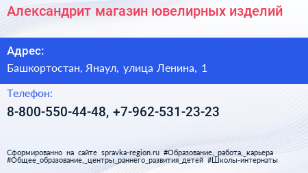Александрит, магазин ювелирных изделий по адресу Башкортостан, Янаул, улица Ленина, 1 в дальнейшем Организация, размещена в следующих категориях: