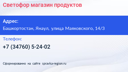 Светофор, магазин продуктов по адресу Башкортостан, Янаул, улица Маяковского, 14/3 в дальнейшем Организация, размещена в следующих категориях: