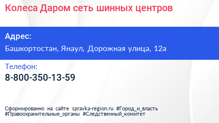 Колеса Даром, сеть шинных центров по адресу Башкортостан, Янаул, Дорожная улица, 12а в дальнейшем Организация, размещена в следующих категориях: