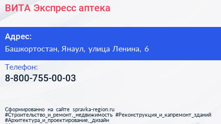 ВИТА Экспресс, аптека по адресу Башкортостан, Янаул, улица Ленина, 6 в дальнейшем Организация, размещена в следующих категориях: