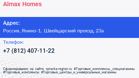 Almax Homes по адресу 23/1, Швейцарский проезд, Кюмлено, Кирполье, Колтушское городское поселение, Всеволожский район, Ленинградская область, Северо-Западный федеральный округ, 188685, Россия в дальнейшем Организация, размещена в следующих категориях: