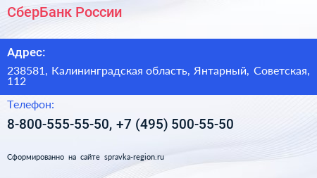 СберБанк России по адресу 238581, Калининградская область, Янтарный, Советская, 112 в дальнейшем Организация, размещена в следующих категориях: