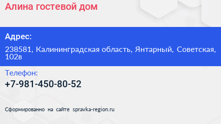 Алина, гостевой дом по адресу 238581, Калининградская область, Янтарный, Советская, 102в в дальнейшем Организация, размещена в следующих категориях: