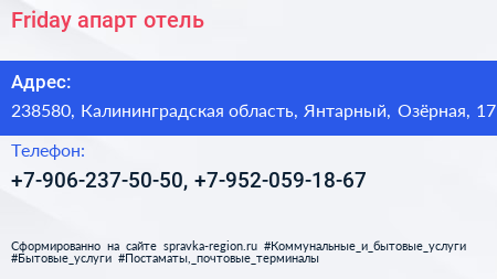 Friday, апарт-отель по адресу 238580, Калининградская область, Янтарный, Озёрная, 17 в дальнейшем Организация, размещена в следующих категориях: