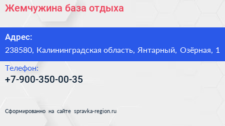 Жемчужина, база отдыха по адресу 238580, Калининградская область, Янтарный, Озёрная, 1 в дальнейшем Организация, размещена в следующих категориях: