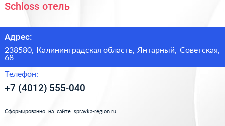 Schloss, отель по адресу 238580, Калининградская область, Янтарный, Советская, 68 в дальнейшем Организация, размещена в следующих категориях: