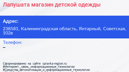 Лапушата, магазин детской одежды по адресу 238581, Калининградская область, Янтарный, Советская, 102в в дальнейшем Организация, размещена в следующих категориях: